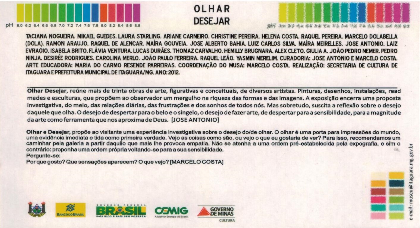“Olhar e desejar” encerra uma proposta investigativa das relações diárias, do meio, das frustrações e dos sonhos de todos nós. Mas, sobretudo suscita a reflexão sobre o desejo daquele que olha. O desejo de despertar para o belo e o singelo, o desejo de fazer arte, de desenvolver a sensibilidade para a magnitude da arte como ferramenta que nos aproxima de Deus...